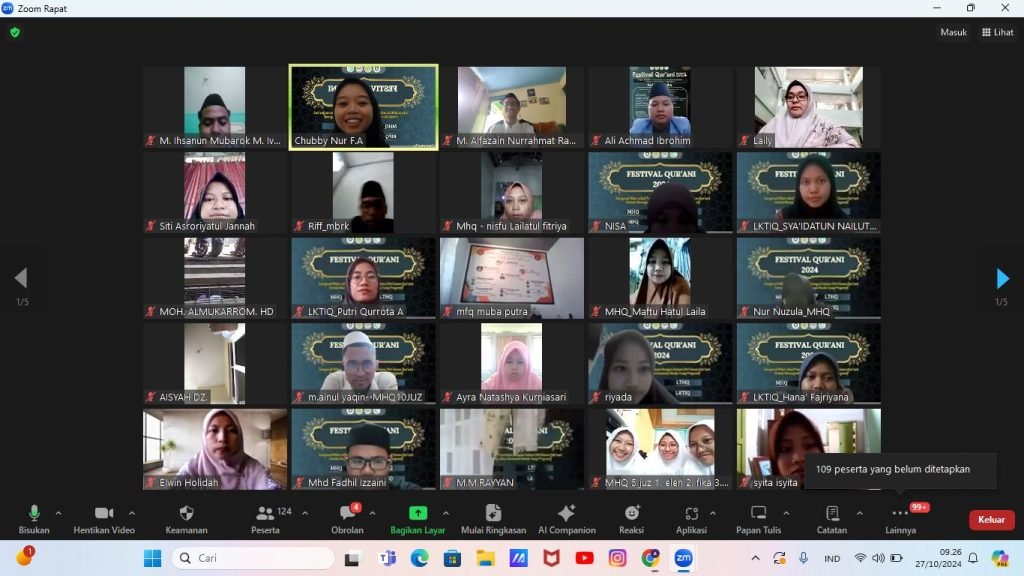 Surabaya – (28/10/2024) Dalam rangka persiapan menuju acara Festival Qur’ani 2024 yang diselenggarakan oleh UKM Pengembangan Tahfidzul Qur’an UIN Sunan Ampel Surabaya, panitia mengadakan Technical Meeting secara online. Kegiatan ini dihadiri oleh para peserta dari Lomba Musabaqah Hifdzil Qur’an tingkat se-Jawa Timur dan se-Pulau Jawa, Musabaqah Fahmil Qur’an tingkat Nasional, Lomba Tartil dan Hafalan Qur’an tingkat se-Jawa Timur, serta Lomba Karya Tulis Ilmiah Al-Qur’an tingkat Nasional.